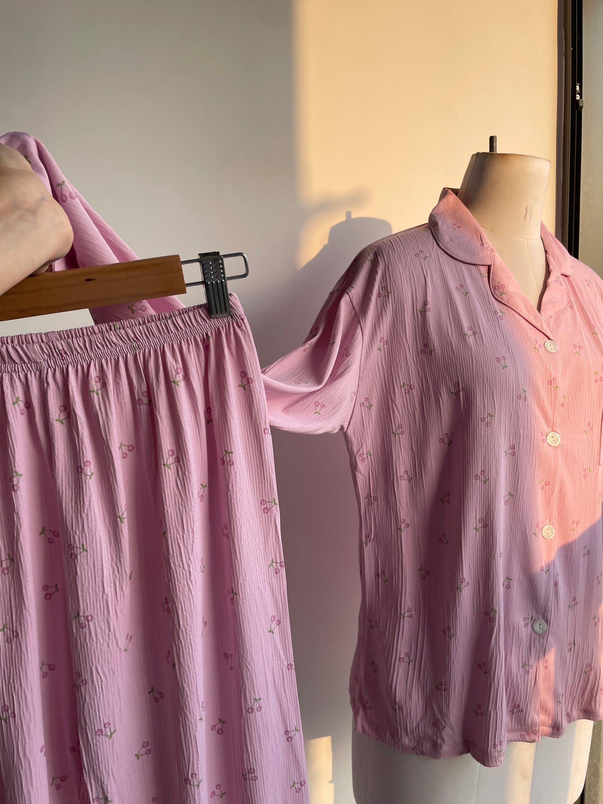 This is a full-length pajama set featuring a long-sleeve button-down top and matching long pants. Made from soft, breathable fabric, it feels gentle on the skin and perfect for all day lounging and night time comfort.